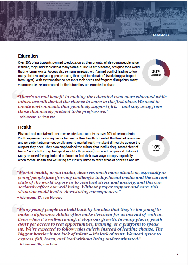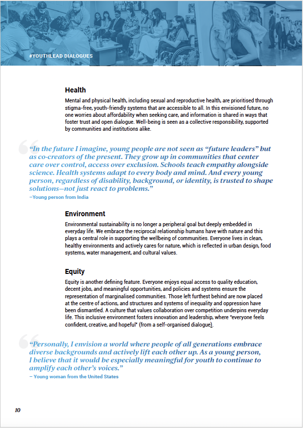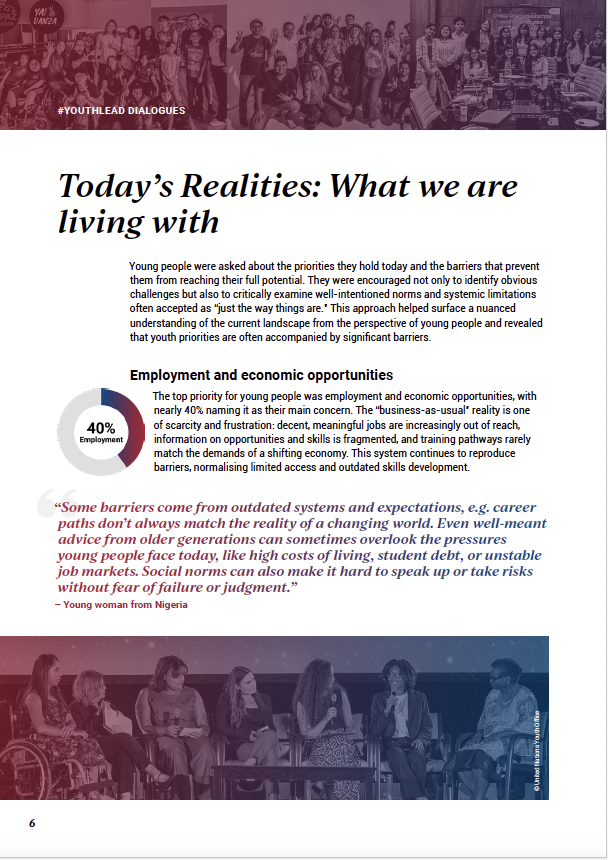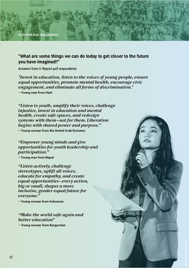 “Young people’s message is urgent, inspiring, and clear. The future they imagine – one grounded in peace, justice, equality, inclusion, sustainability, and solidarity – is not a dream too distant or idealized; it is practical, realistic, and within our reach. Yet the gap between this vision and today’s realities remains wide. From barriers to education and decent jobs, to rising mental health concerns, the climate crisis and eroding trust in institutions, young people are deeply concerned about the world they live in. Closing this gap requires urgent action – nurturing seeds of change, restoring hope, and forging the way forward together.”– Felipe Paulier, Assistant Secretary-General for Youth Affairs