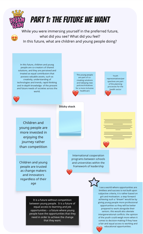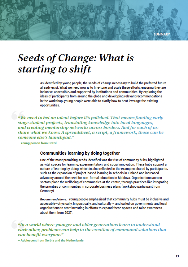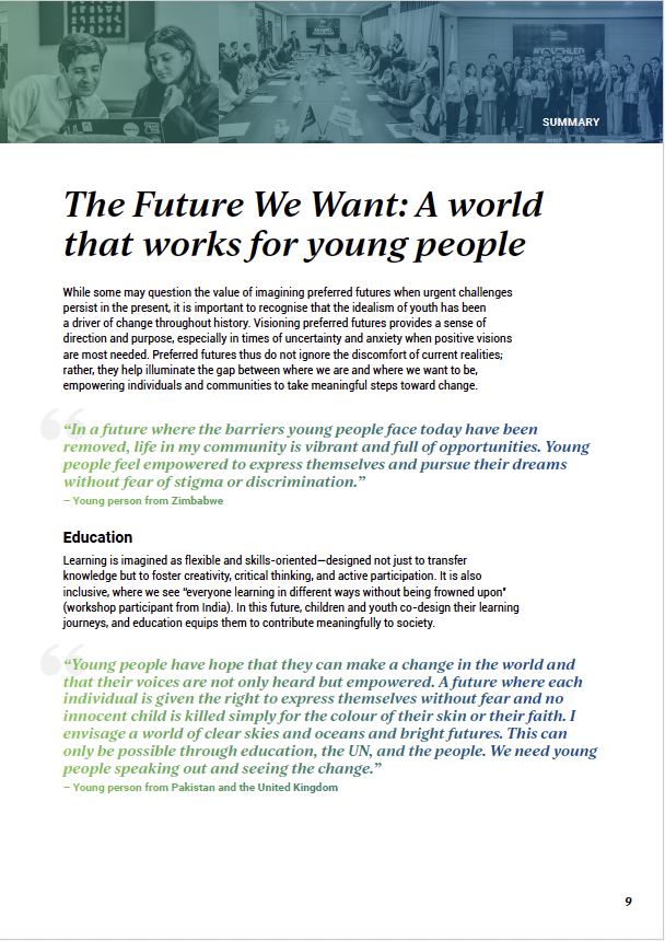 Youth foresight provides the space for young people to connect with each other, learn from the diverse contexts they represent, and build on points of convergence towards collective action. Deconstructing ways through which the preferred future could be reached has inspired excitement and agency, while highlighting areas for prioritization and milestones.
