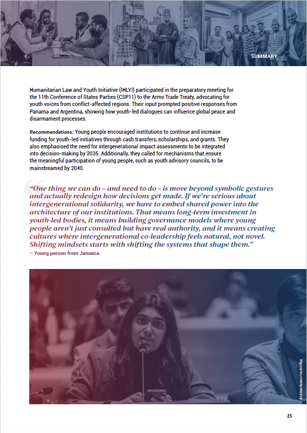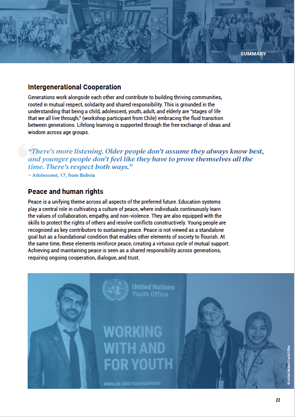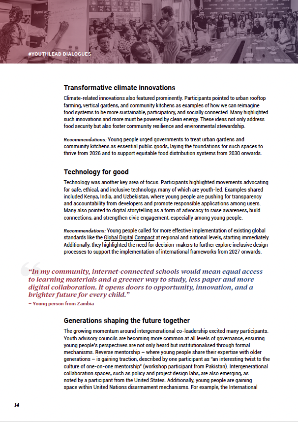 The ideas presented in the report help to ensure that youth perspectives guide policies and programmes at every level. This demonstrates that multilateralism is not confined to closed rooms. It flourishes wherever young people are heard and shows us that fostering youth participation in decision-making means meeting them where they are.