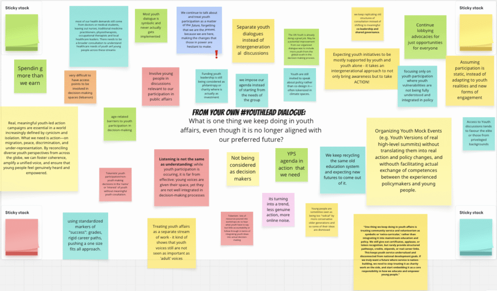 The series of youth consultations culminated in a #YouthLead Dialogue: Foresight Workshop that took place on 4 September 2025. Drawing on insights from the decentralized youth foresight exercise, the virtual workshop engaged more than 40 youth from all regions in a Back Casting exercise to develop recommendations in realizing shared visions and seeds of change. During the exercise participants were encouraged to imagine that the preferred future had already been achieved. Then, they traced a 30-year path back to the present, identifying milestones and interventions that contributed to building the preferred future.