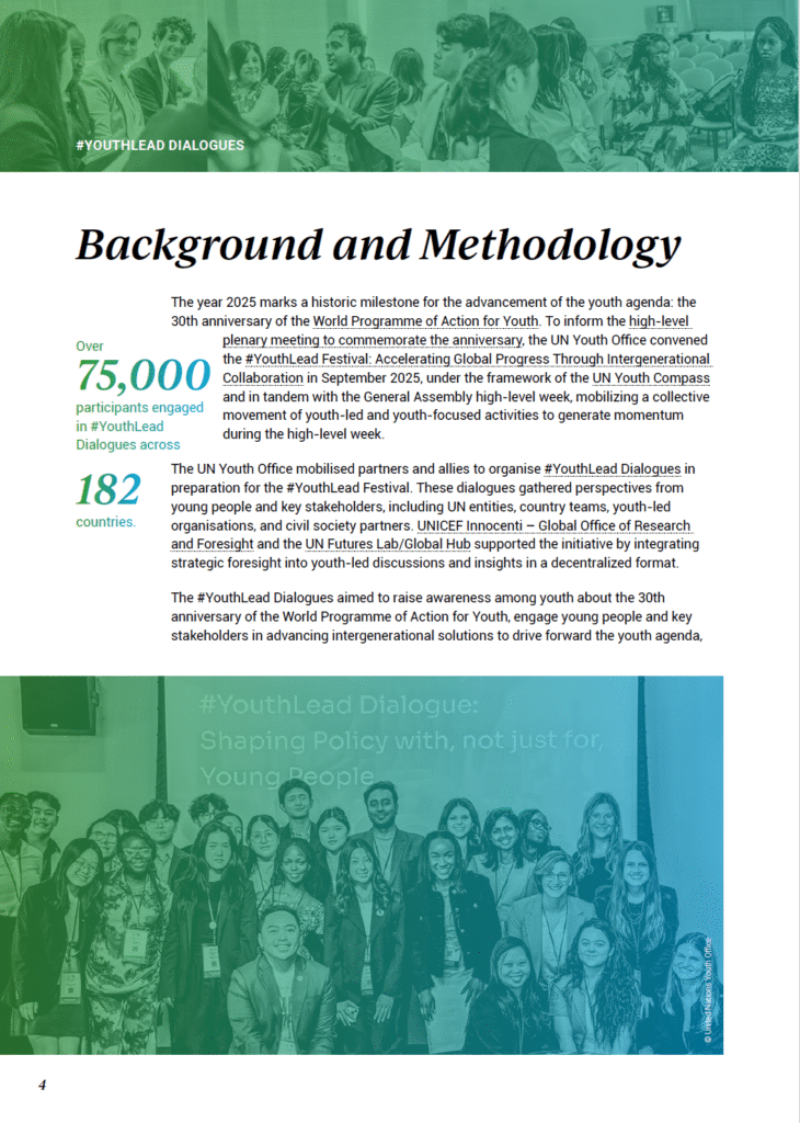 The UN Youth Office mobilised partners and allies to organise #YouthLead Dialogues in preparation for the #YouthLead Festival. These dialogues gathered perspectives from young people and key stakeholders, including UN entities, country teams, youth-led organisations, and civil society partners. UNICEF Innocenti – Global Office of Research and Foresight and the UN Futures Lab/Global Hub supported the initiative by integrating strategic foresight into youth-led discussions and insights in a decentralized format.